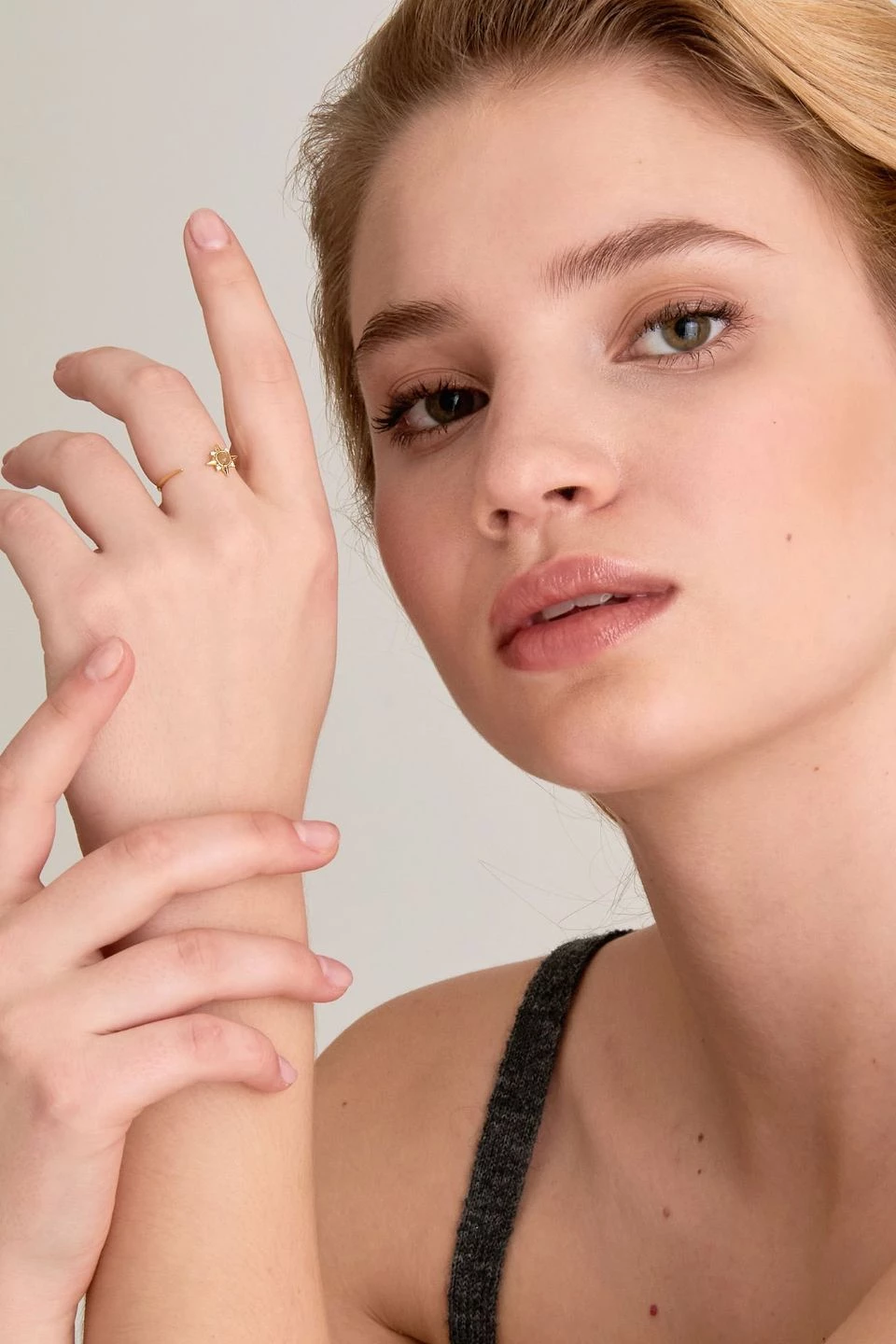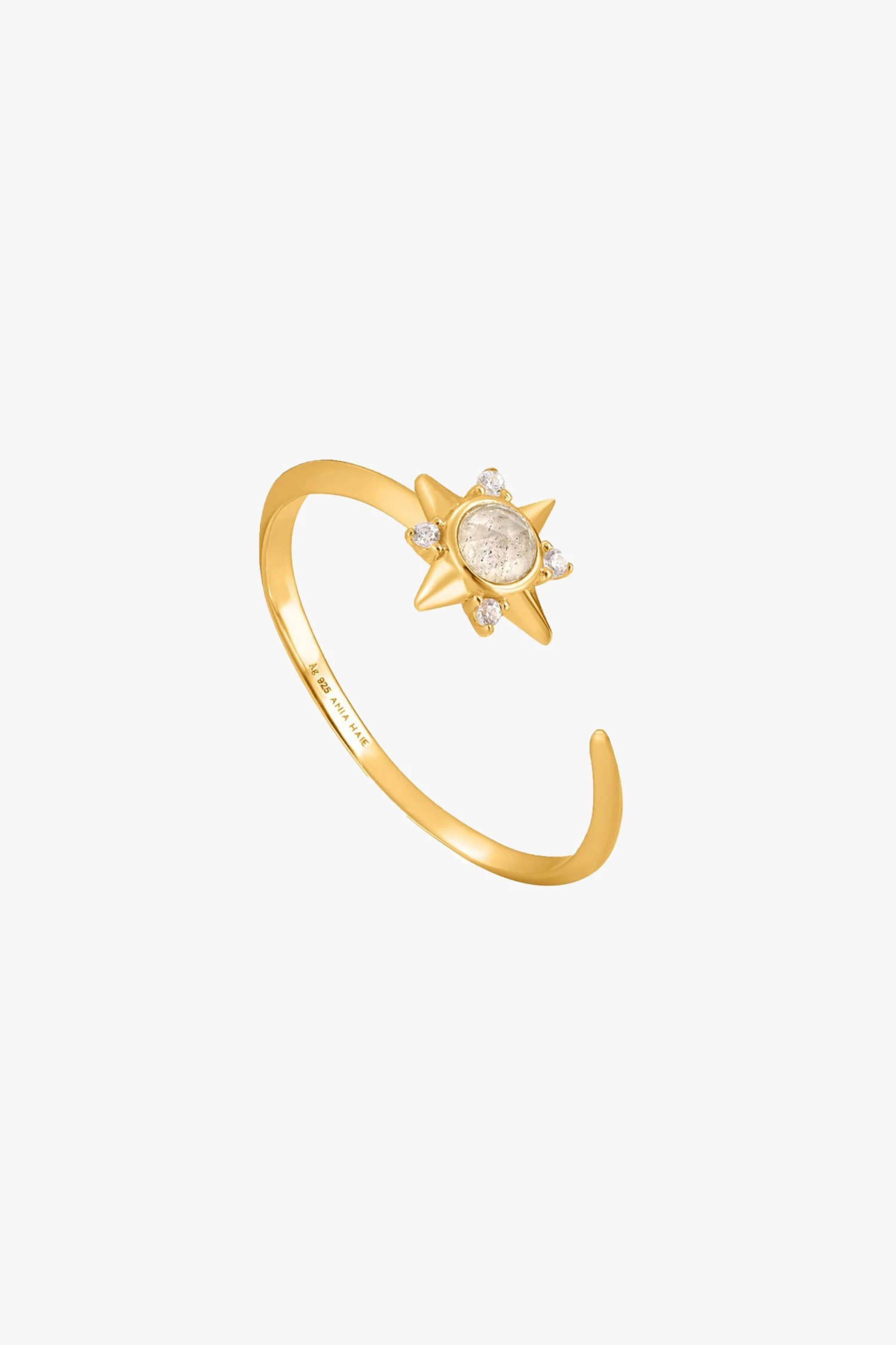 Craft a look that exudes your style with a celestial adjustable ring inspired by the runway. Shine bright with a natural labradorite stone centrepiece and four cubic zirconia star accents. Gently squeeze to adjust the sizing for your perfect fit.