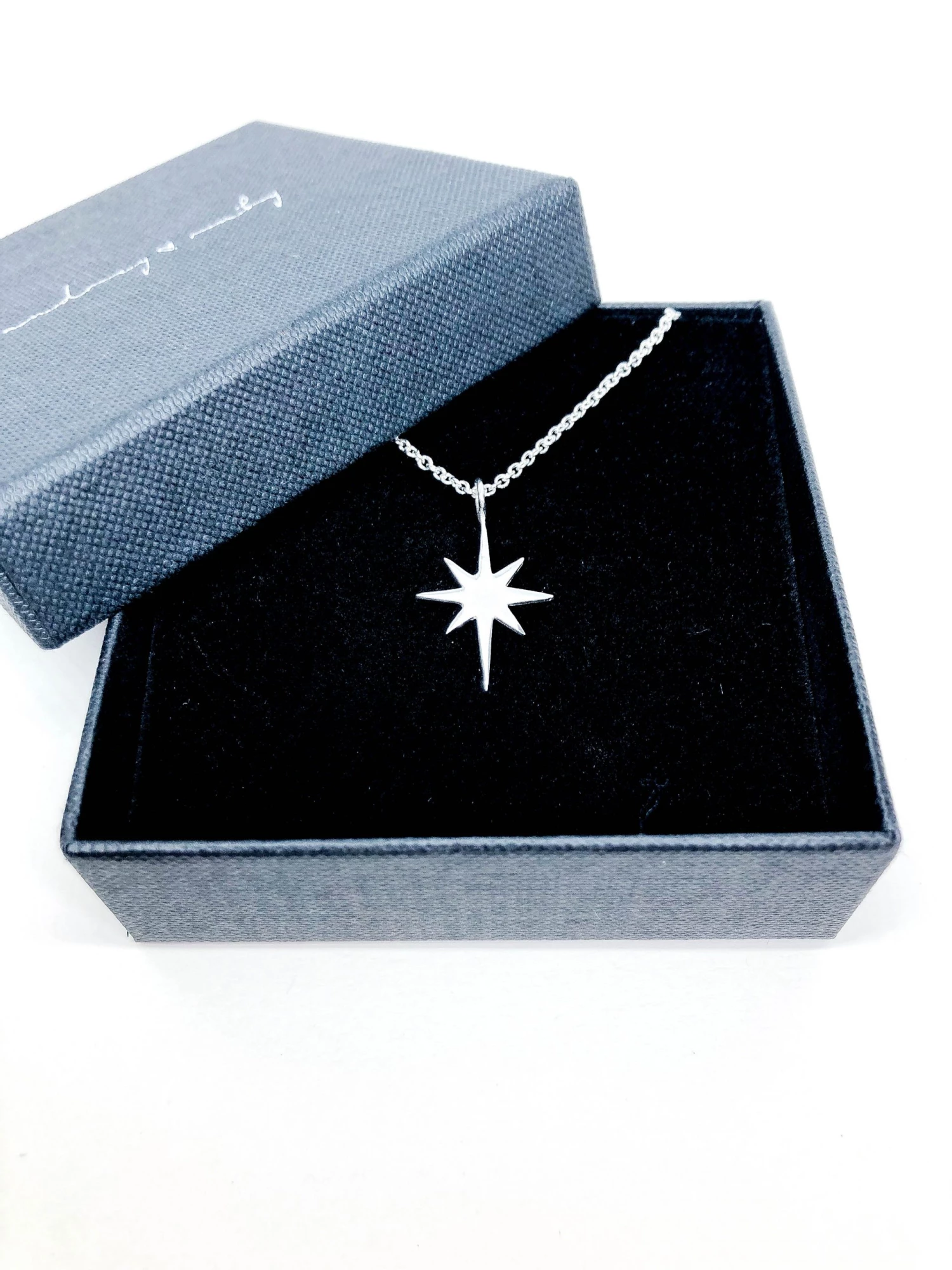 This beautiful sterling silver or 14ct gold plate starburst hangs on a 40cm chain. The starburst measures 2cm.