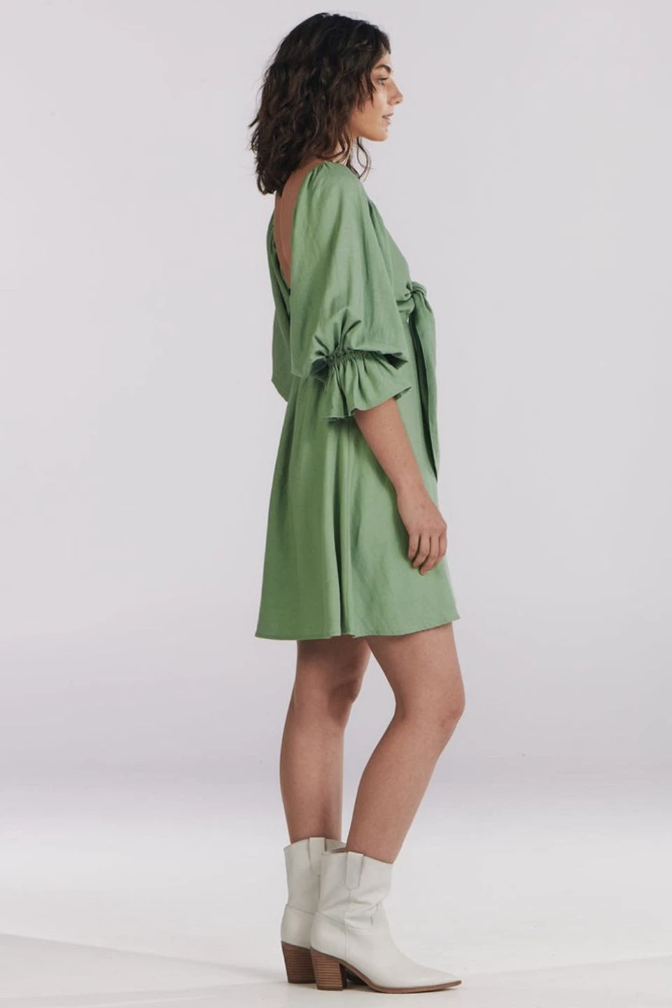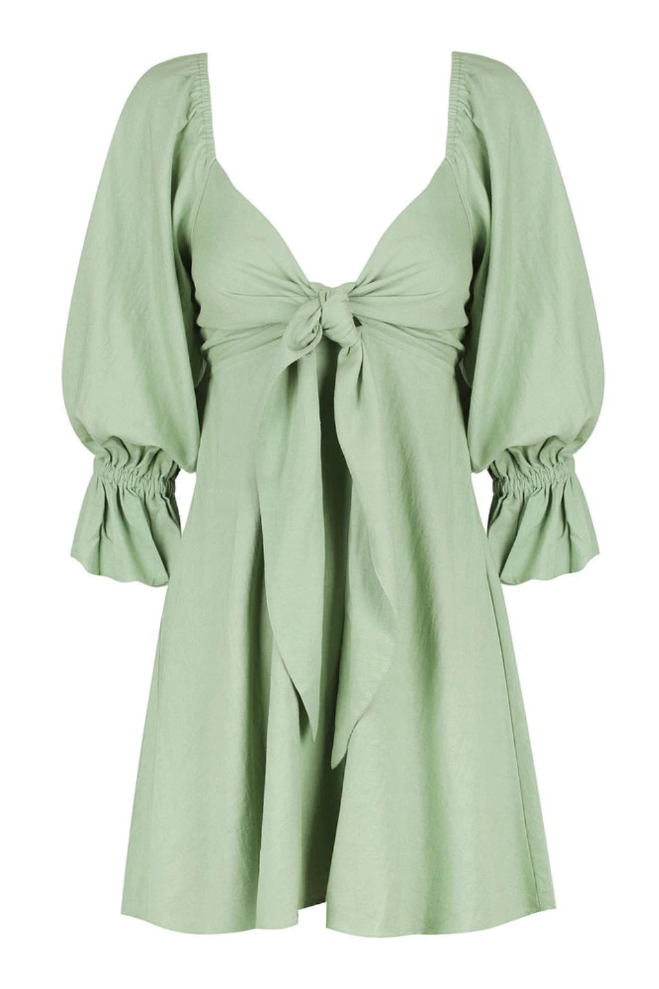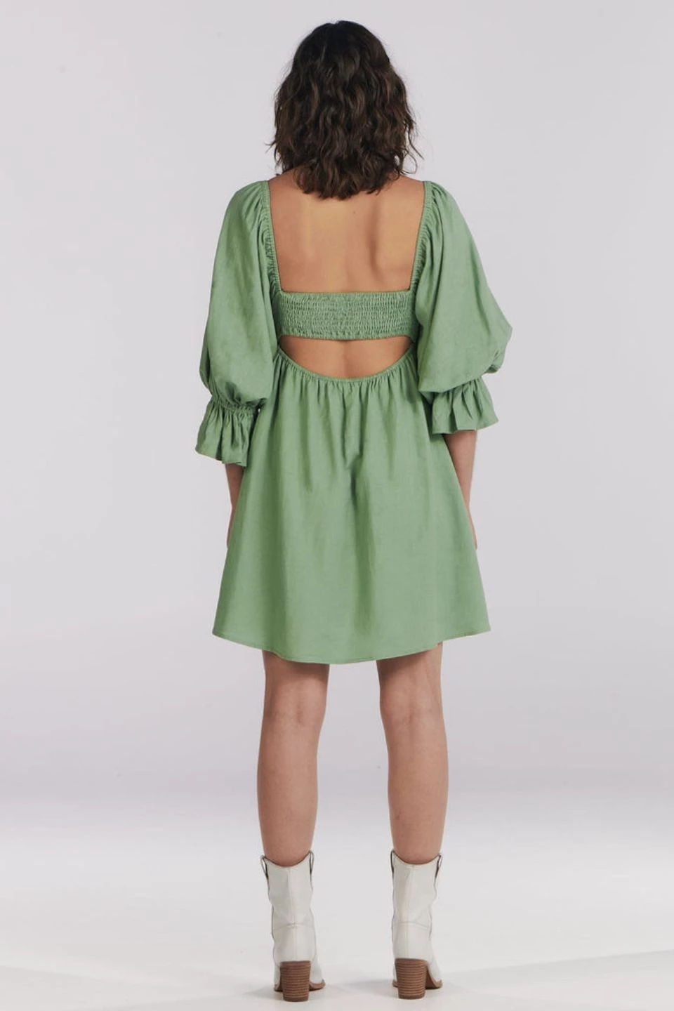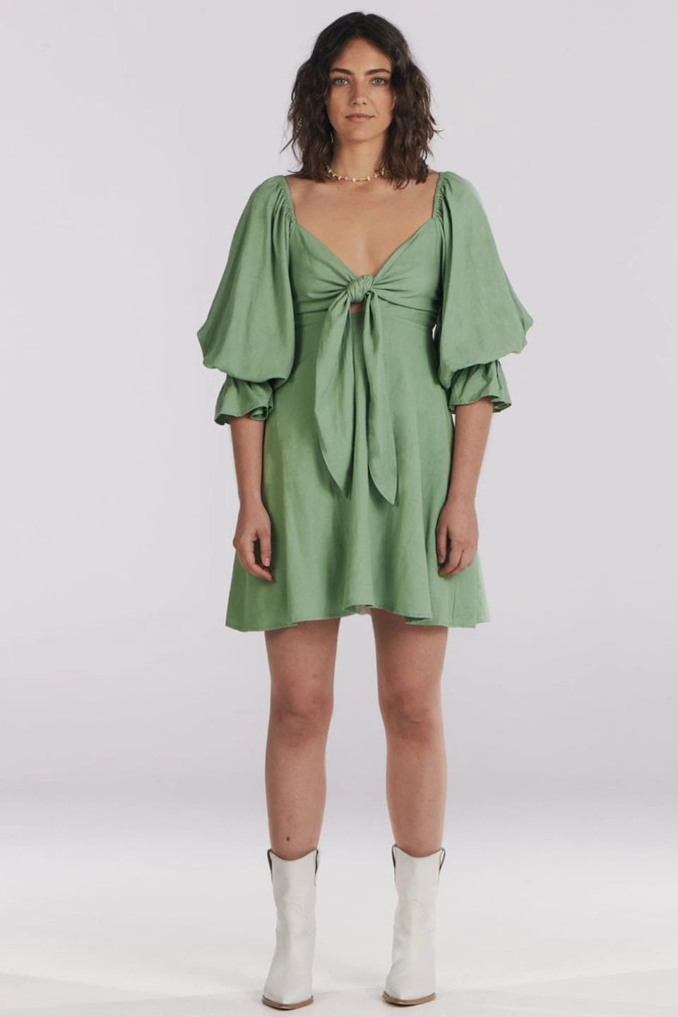 A calming sage green hue gives this sweet babydoll mini dress a lovely feel, while its puff sleeves lend vintage charm. Dress it up with tan heels or wear with white trainers for a fun daytime look.