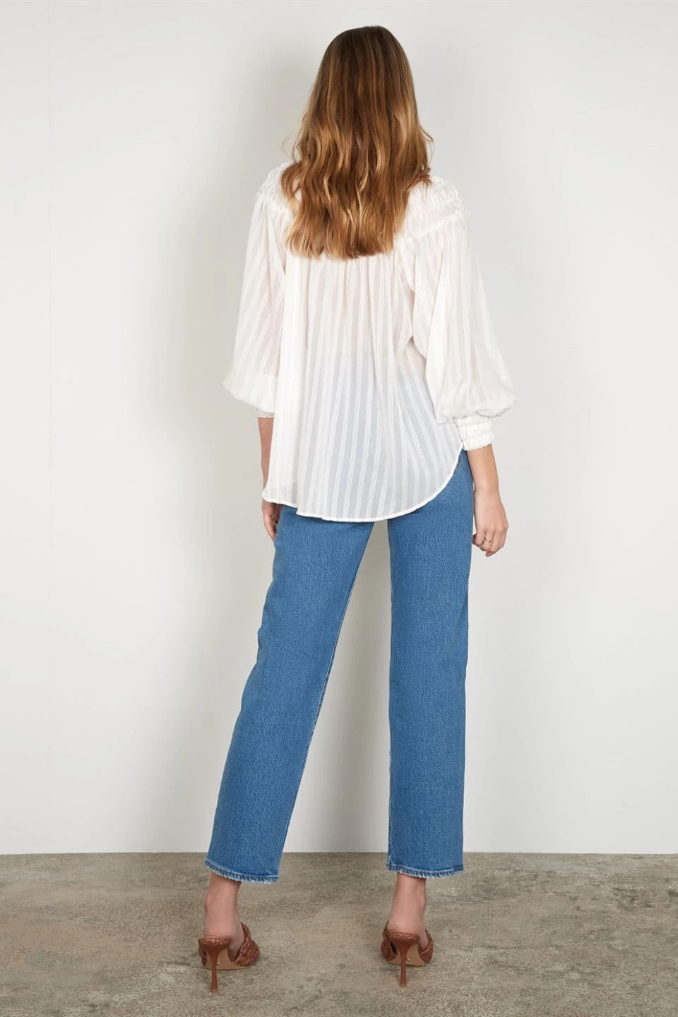 Add a classy touch to your looks with the Carmine blouse from Esmaee. This stylish blouse features a high neck, sheer fabric, and floaty long sleeves with shirred cuffs.