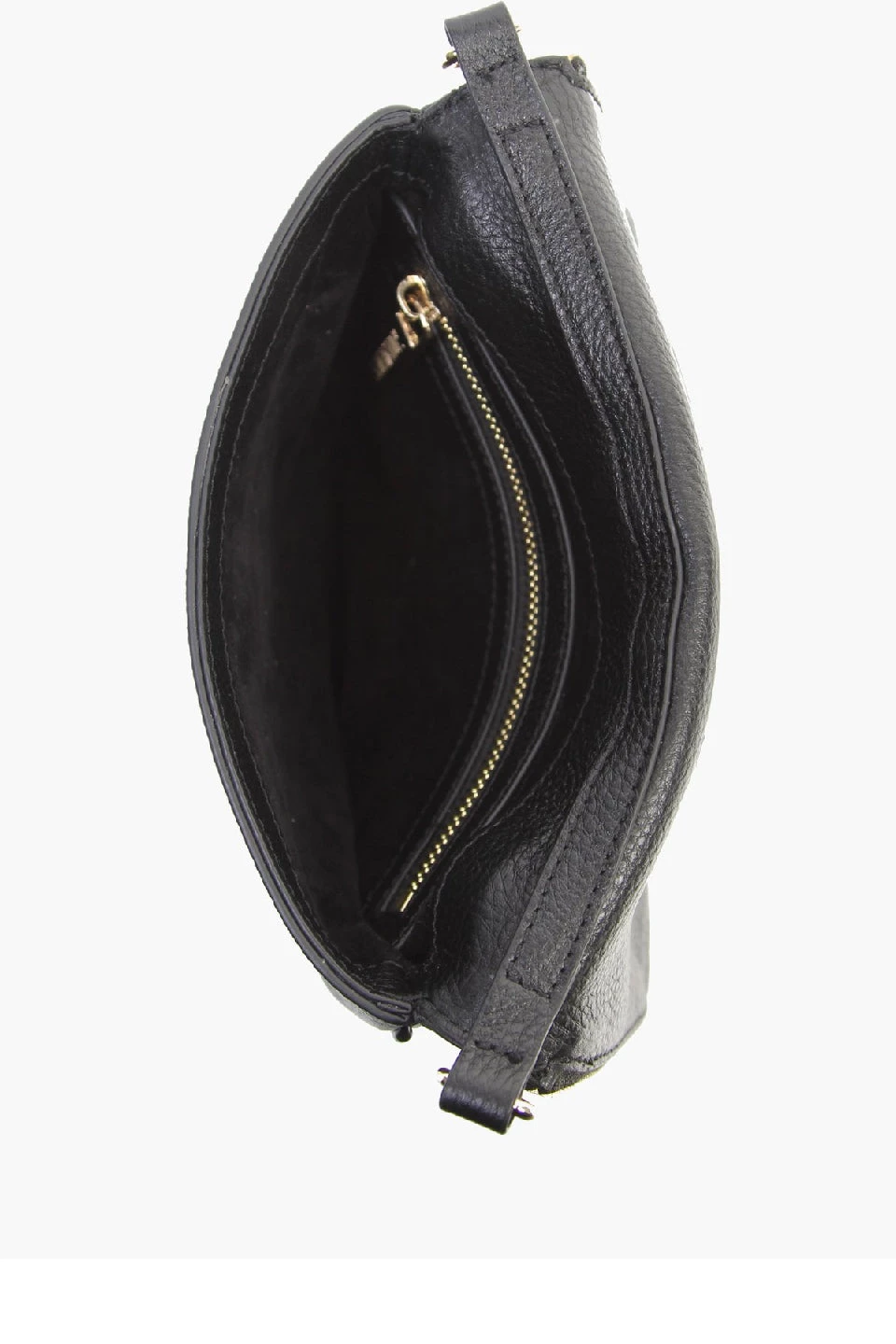 Soft pure leather in just the right size to have all your necessities. Gold zip and hardware detailing and adjustable strap.