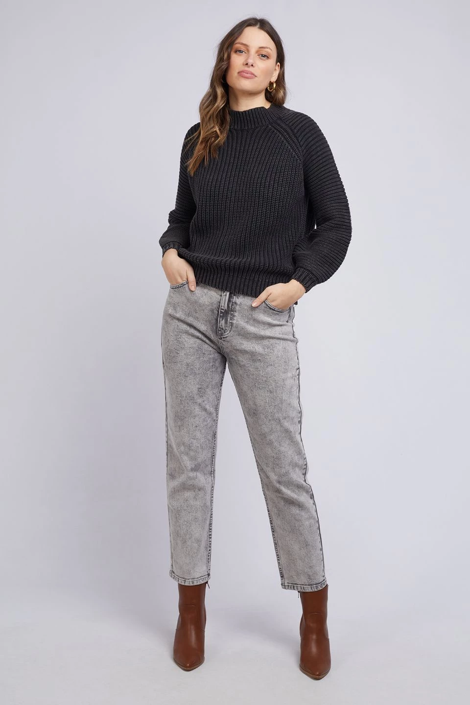 The Collins knit by Foxwood is as Cute as can be the chunky rib knit with mock neck. This mid length knit makes it perfect to pair with high waisted styles.