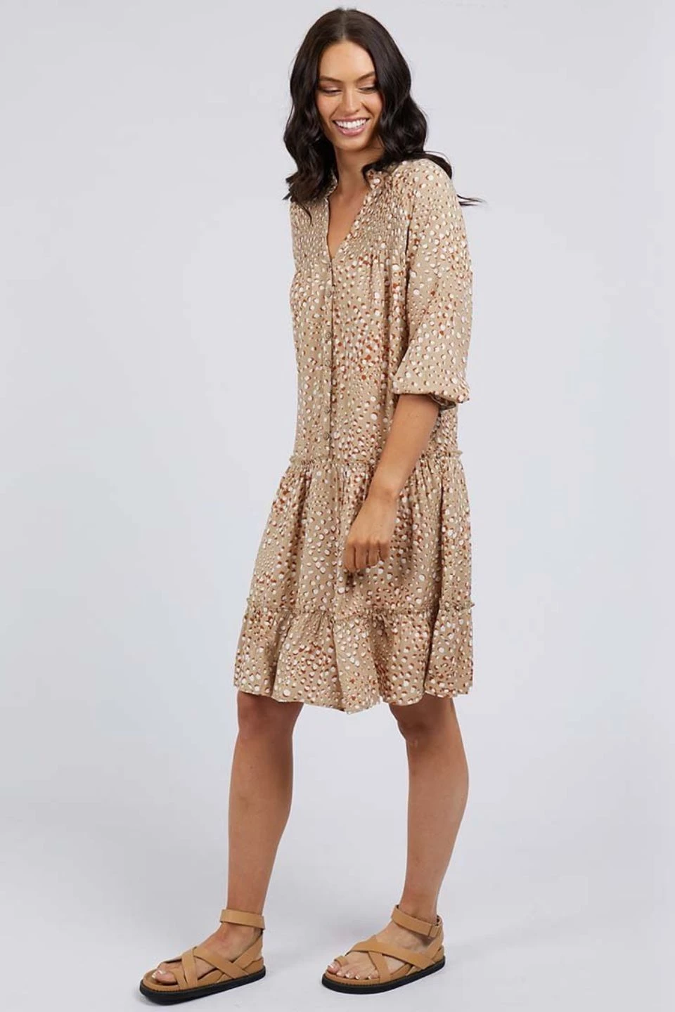 The Gillian Button Front Tiered Mini Biege Animal Dress is the perfect little dress for warmer weather! This dress is super light and easy to wear, pefect for those beach days!
