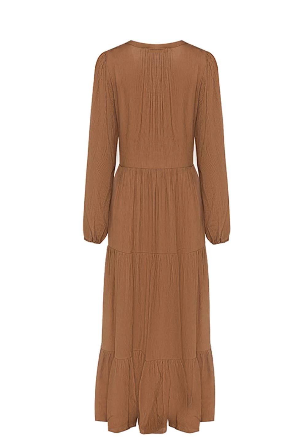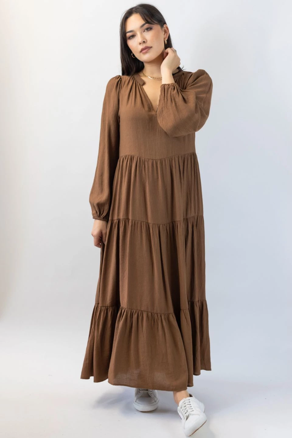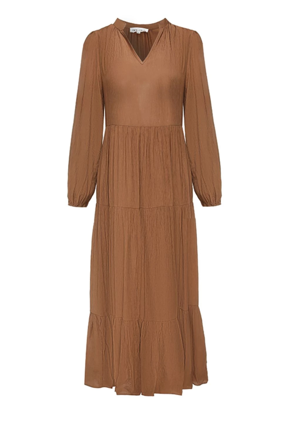 We are in love with the Kendall pecan crinkle midi dress by Ivy + Jack featuring a stunning V neckline and long blouson sleeves. Pair this dress with heels for a night out or go for a more casual look with your favourite sneakers.