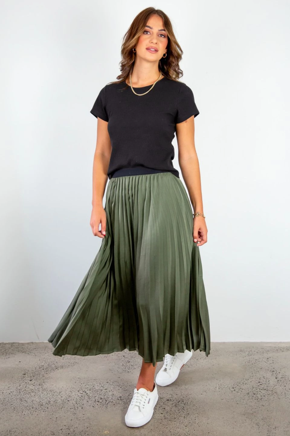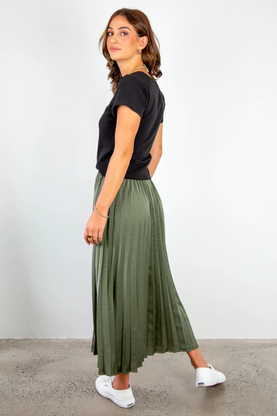Feel fabulous in this stunning Radiant pleated midi skirt! This is the skirt that has it all: gorgeous shape, luxurious washer satin material, and a great fit!