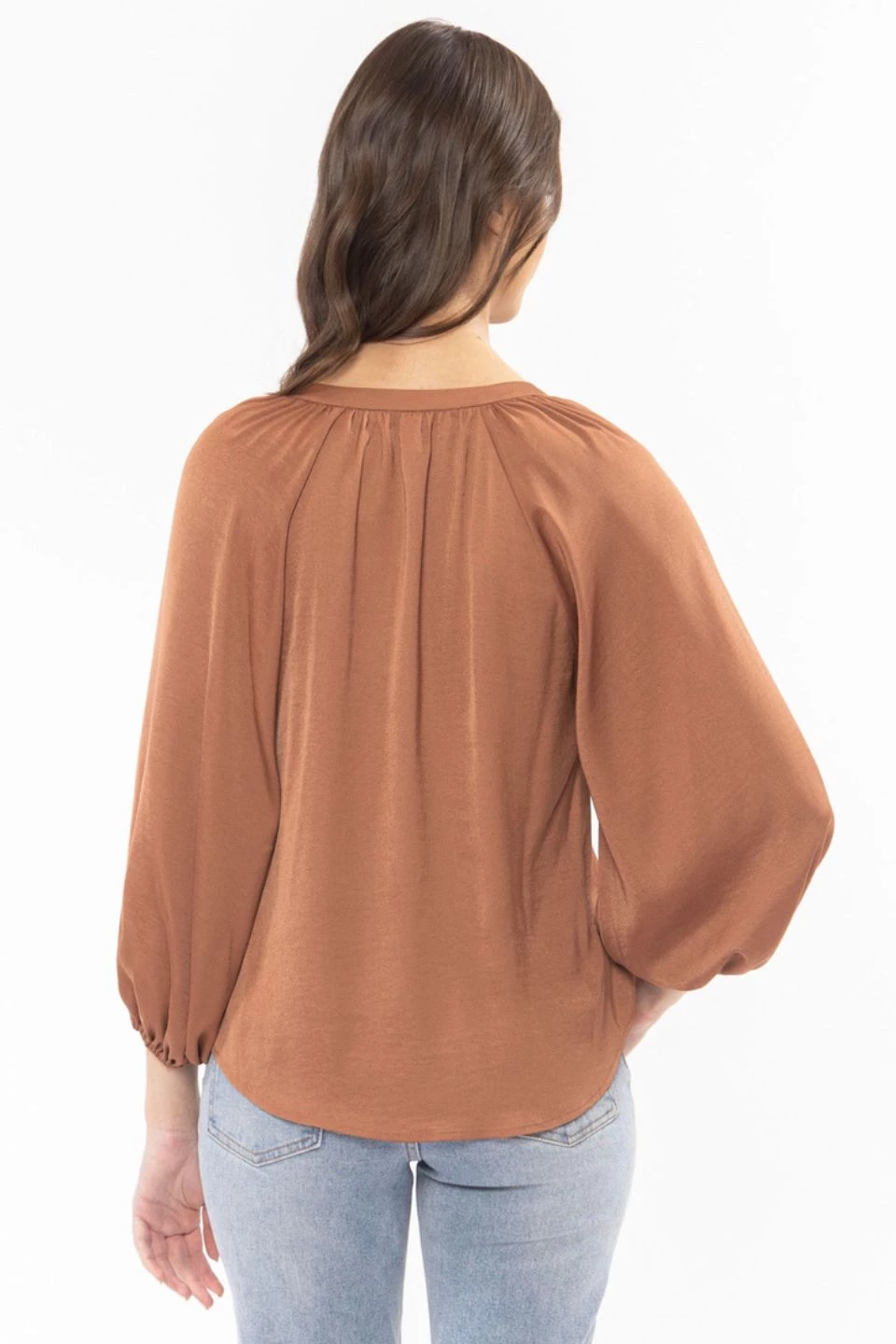 The Intuitive Rust Washer Flutter Sleeve Top created with a satin finish makes it easier to wear from desk to dinner. Its flattering design features a V-shaped neckline and long flutter sleeves for a feminine touch. Style it with a mini skirt for social occasions or pare it back with jeans for a dinner date.