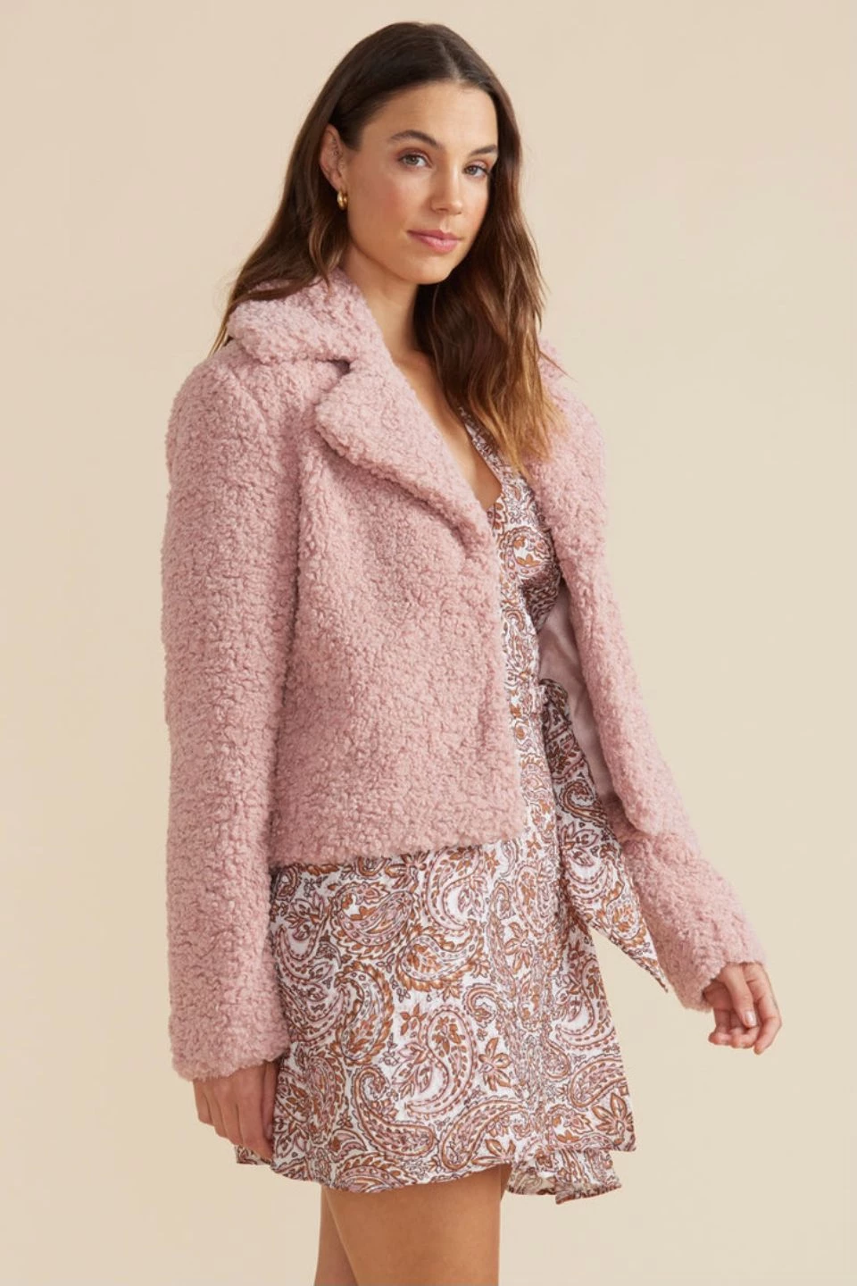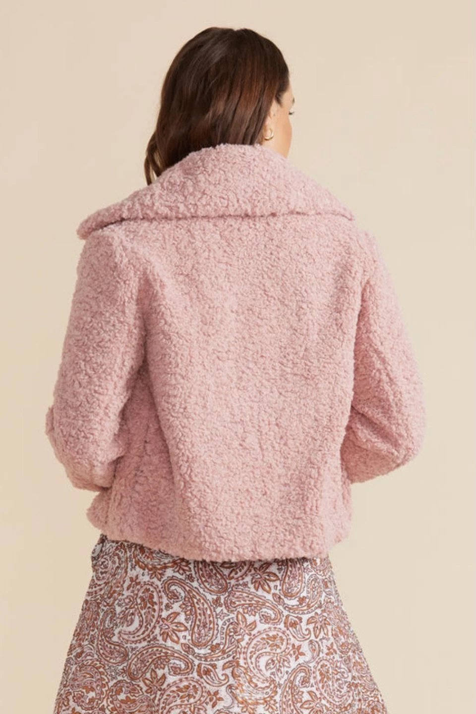 Looking for a statement go-to jacket to elevate any look this season? Look no further than our Yelena Jacket. In a luxe dusty pink faux sherpa fur with a wide collar, wear over anything and warm up in style.