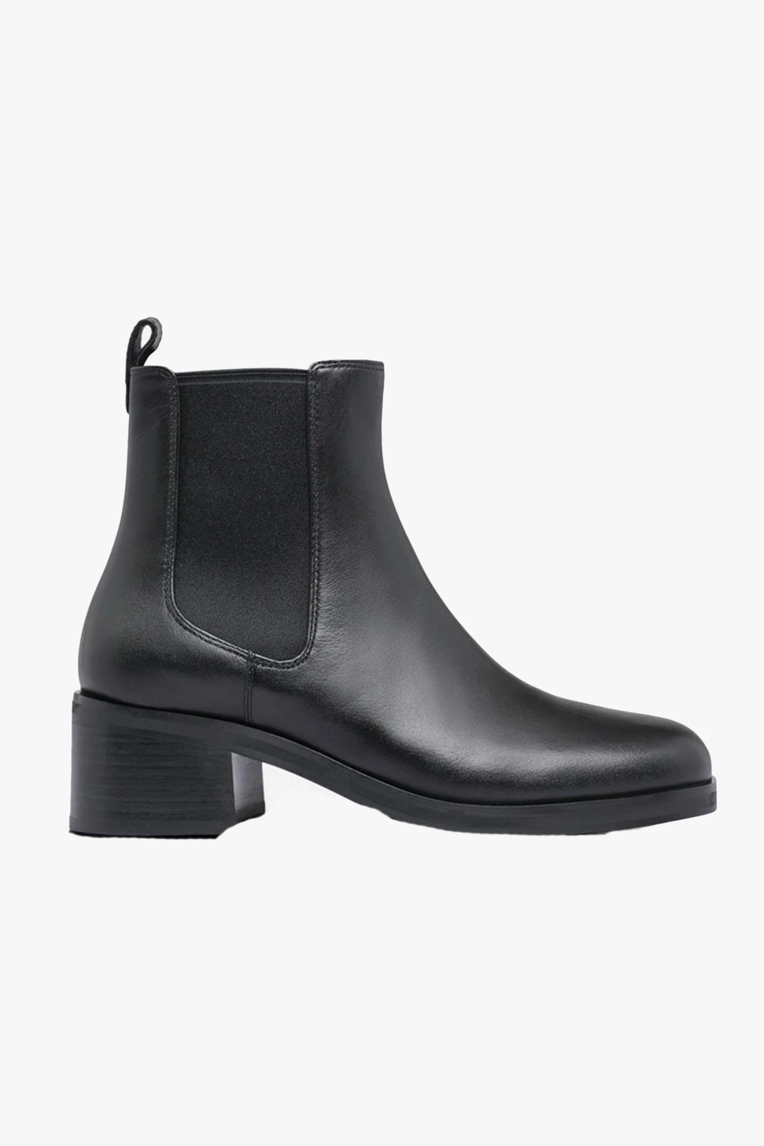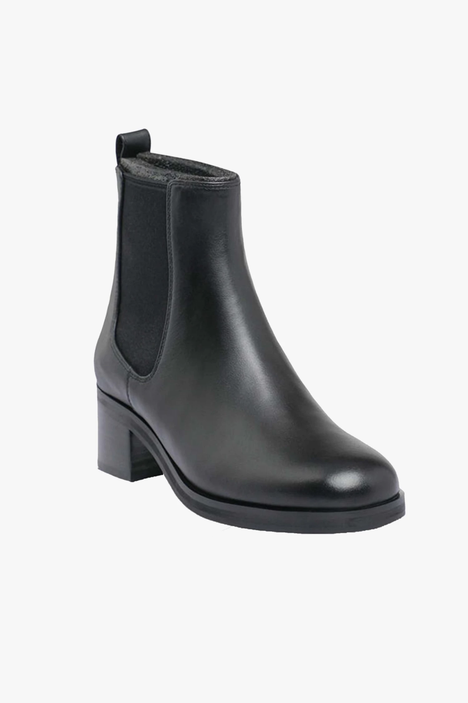 A deeply set elasticated gusset and classic rounded toe shape made from a rich leather sits atop a thick modern sole and 2.5cm wood stacked heel.